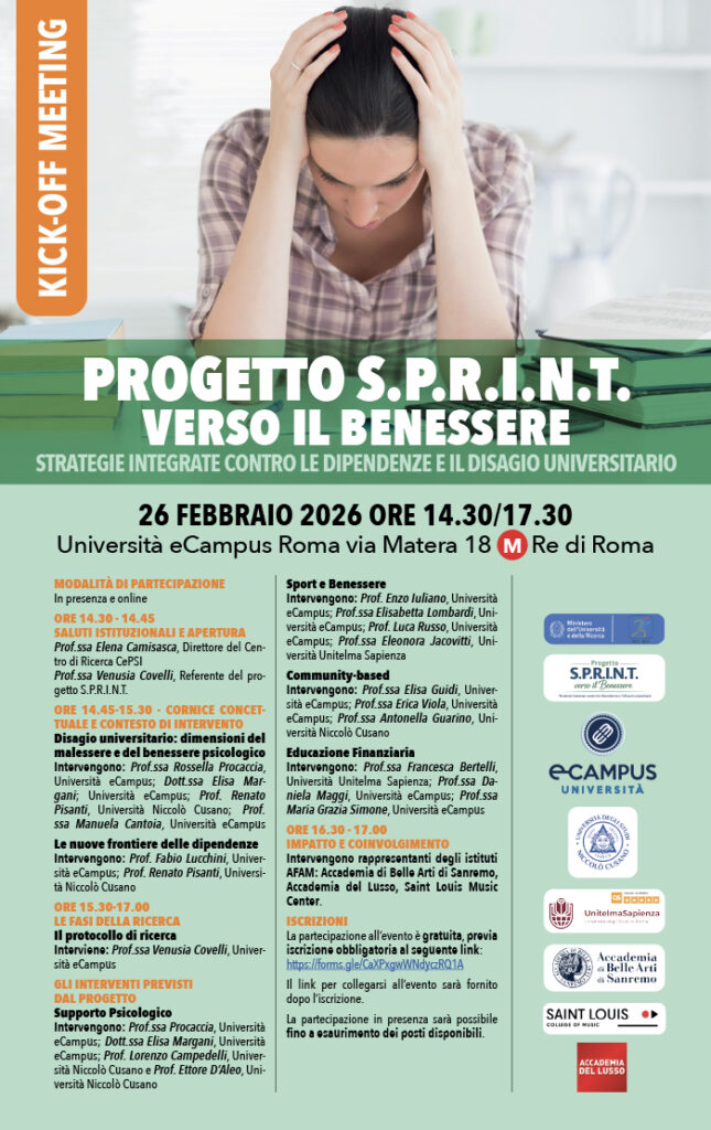 Le professoresse Maria Grazia Simone e Daniela Maggi, entrambe docenti eCampus e membri del Centro Ricerca Educazione Didattica Digitale Innovazione sociale (CREDDI), hanno partecipato al Kick Off Meeting per il Progetto S.P.R.I.N.T. (Strategie Integrate contro le dipendenze e il disagio universitario), di cui è referente la prof.ssa Venusia Covelli. Il progetto è stato presentato il 26 febbraio 2026, presso la sede eCampus di Roma, durante l’incontro sono state presentate delle strategie integrate per contrastare le dipendenze (anche da gioco d’azzardo) e il disagio psicologico nel contesto universitario. L’evento ha esplorato diverse dimensioni del benessere studentesco, dai protocolli di ricerca agli interventi pratici di supporto psicologico, educativo e sportivo. In questo quadro multidisciplinare, un rilievo particolare è stato dato al legame tra educazione finanziaria e benessere. Nello specifico, le professoresse Simone e Maggi sono intervenute approfondendo come la gestione consapevole delle risorse economiche rappresenti una competenza fondamentale per prevenire situazioni di stress e precarietà che spesso alimentano il disagio accademico minacciando la salute mentale e la resilienza degli studenti universitari.